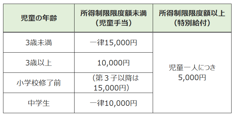 中学校卒業まで(15歳の誕生日後の最初の3月31日まで)の児童を養育している方が対象で、支給額は以下のとおり。